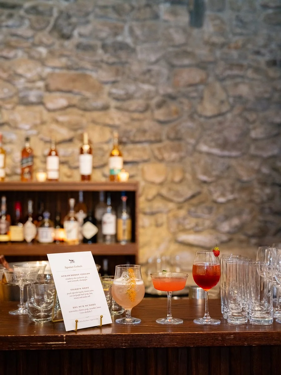 Cocktails took place in the Lower Haybarn, with the jazz band continuing to set the tone. Guests enjoyed two signature drinks: a summery blend of peaches, Reposado tequila, Madeira, lemon and a peach salt rim, and a strawberry, gin, sweet vermouth and champagne cocktail. Before moving to the Upper Hayloft for dinner and dancing.