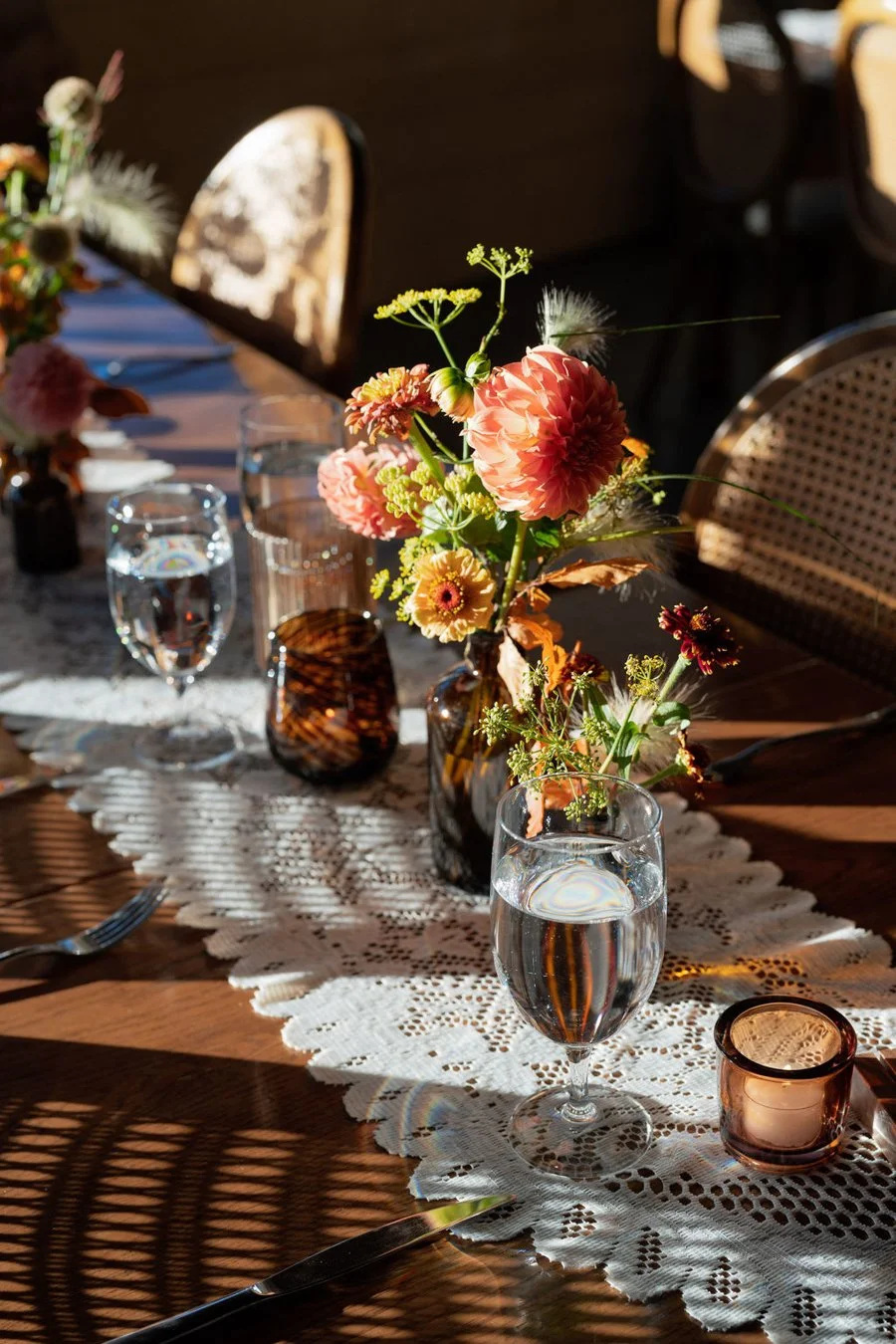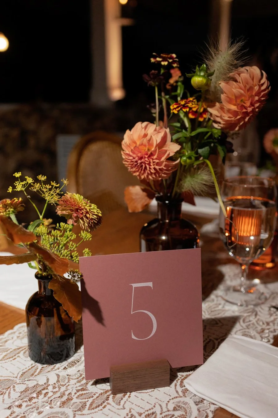 The Welcome Dinner set the tone for the weekend. Simple, chic, and romantic, it was designed as an intimate kickoff for close family and friends. Guests gathered in the Pavilion, where Cedar Lakes Estate’s elegant wooden tables and cane backed chairs were styled with lace runners, each slightly different for a vintage feel. Amber bud vases filled with fall toned flowers lined the tables, while a dramatic foliage and flower lined entrance accented with lanterns created a strong sense of arrival.