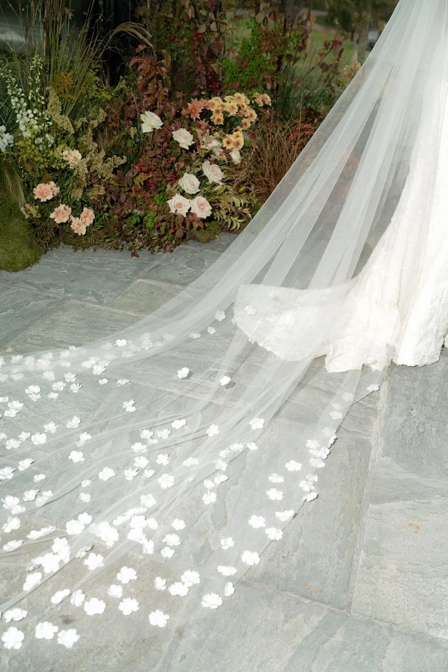 Jordan carried a modern bouquet of striking blue hydrangea, while the bridesmaids carried mixed bouquets in mixed fall tones. Low gardens framed the couple, lanterns lined the aisle, and additional floral moments marked the Glasshouse entrances, creating a cohesive and immersive ceremony setting.