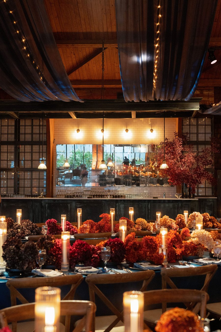 Overhead, gauzy navy fabric panels draped the ceiling, framing the chandeliers and string lights while drawing the room inward. Tall branches installed along the beams behind the head table created a striking backdrop and defined the entrance into the space. A cozy lounge vignette furnished by Patina offered a quieter retreat, layered with additional branches by Mimosa.