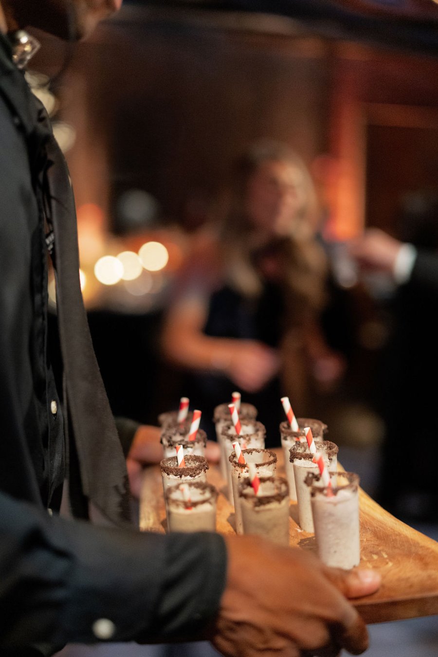 Guests enjoyed a beautifully executed plated dinner, beginning with a shaved Brussels sprouts and baby kale salad, followed by a choice of pan seared wild salmon or petite filet mignon, with a thoughtfully prepared vegetarian option as well. Desserts were passed throughout the room alongside donut displays and mini jar treats.