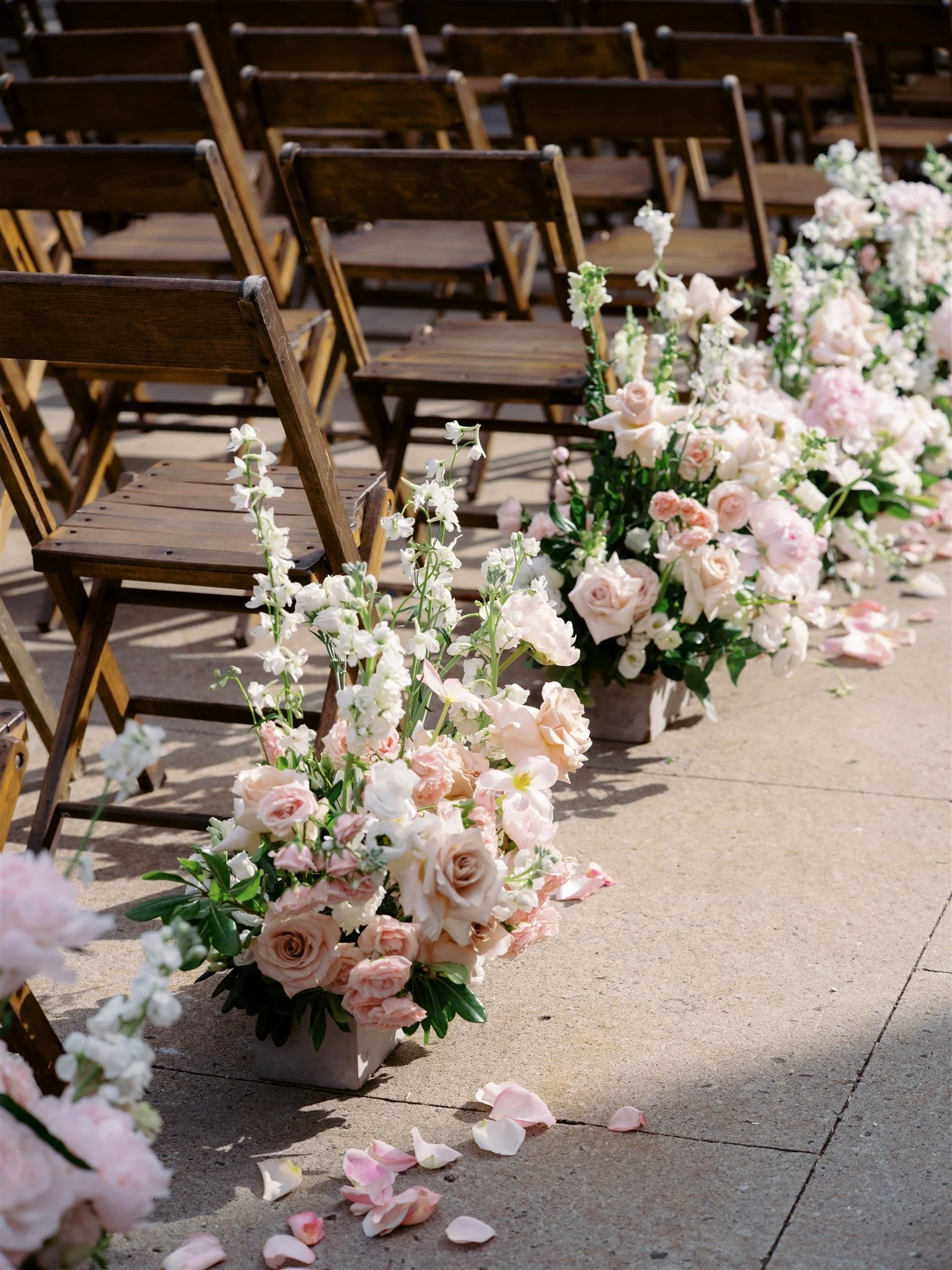 The flowers by Poppies and Posies were lush and full, a complete vision of spring. A wooden chuppah was dressed in soft white fabric and covered with dense peonies, garden roses, and ranunculus in creamy white, blush, and petal pink. The aisle flowers appeared to bloom from the ground, lined with roses and lisianthus, while cones of rose petals waited on each chair lining the aisle. Miranda carried a bouquet of petal pink peonies, blush sweetpea, and garden roses, and her bridesmaids held softer, more muted versions tied with grosgrain ribbon.