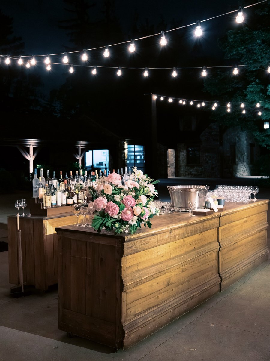 Dinner took place in the Upper HayLoft, where birch bentwood chairs with ivory cushions surrounded tables alternating between tall and low floral centerpieces. Arrangements of creamy white, blush, and petal pink peonies, ranunculus, garden roses, and sweetpea filled aged gold vases or rose above the tables on elegant stands. Taper candles under glass shades glowed softly. The sweetheart table featured a lush floral installation that seemed to grow from the tabletop, the perfect expression of Miranda’s love of flowers.