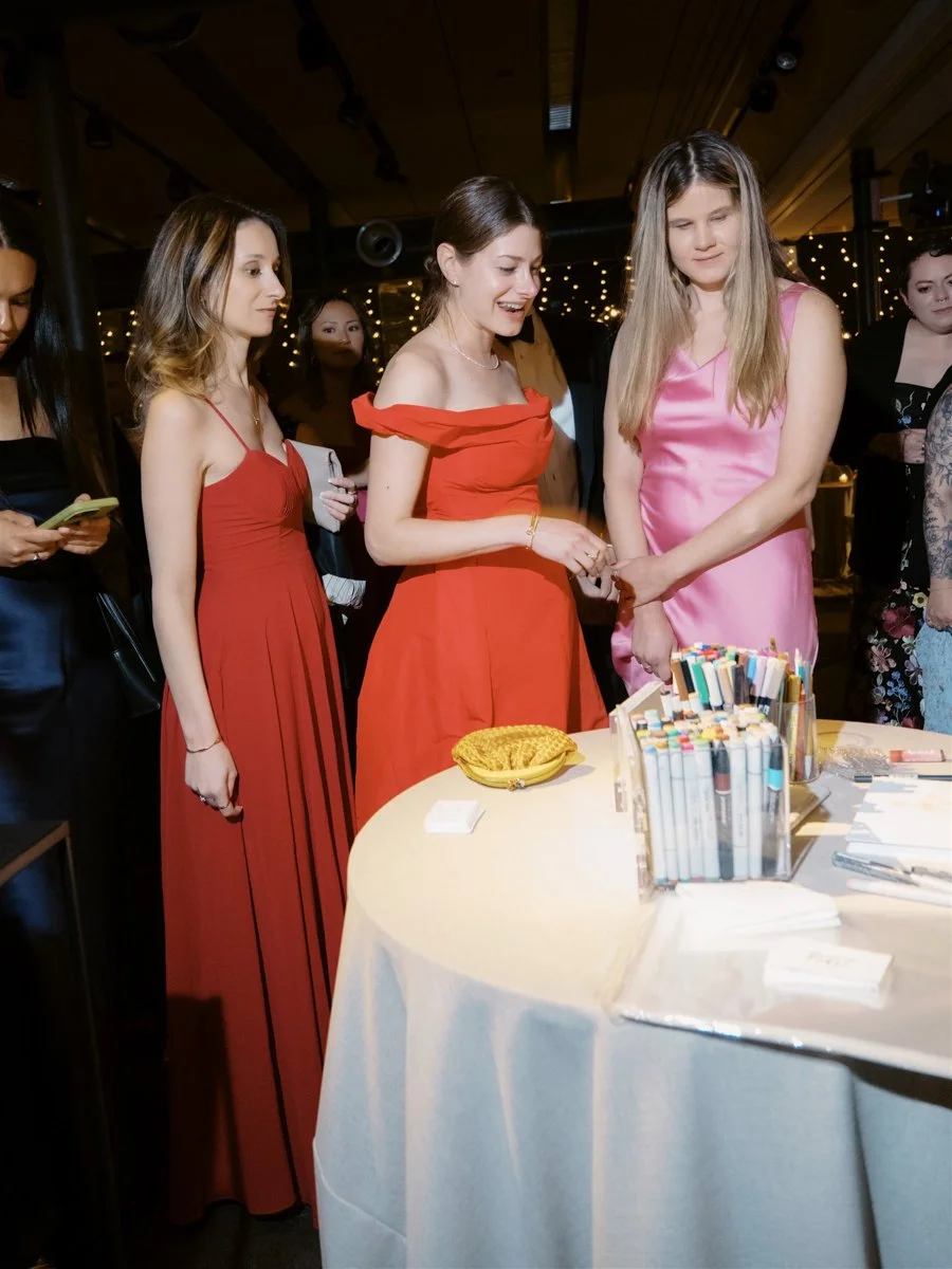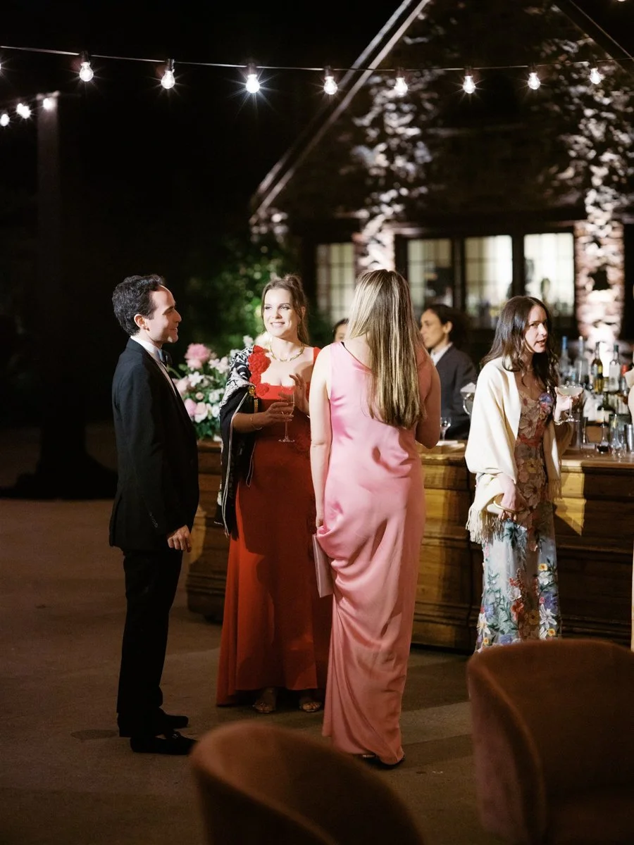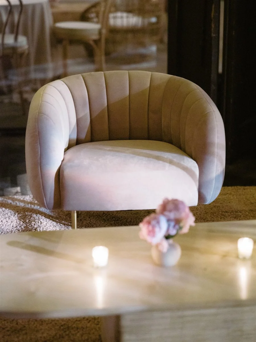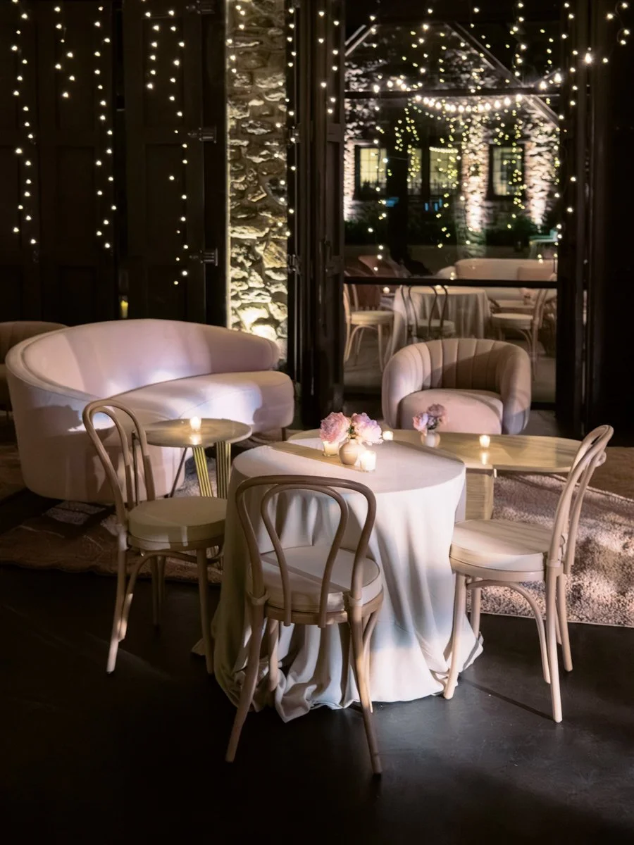 After dinner, guests were invited downstairs to the lower HayBarn for the Horah and a spirited after party. The space was transformed with fairy lights along the wall and a mirrored disco ball above the dance floor. We brought in lounges by Patina featuring curved petal sofas and blush Frida chairs inside, with rattan pieces arranged in the courtyard. Deanna First sketched live fashion illustrations of guests throughout the night, creating one of a kind keepsakes and drawing a steady line of admirers eager to be captured on paper.