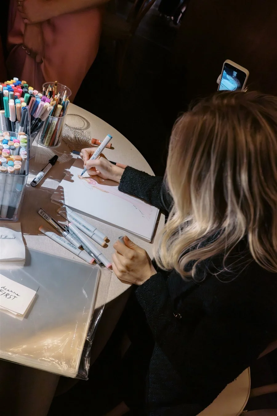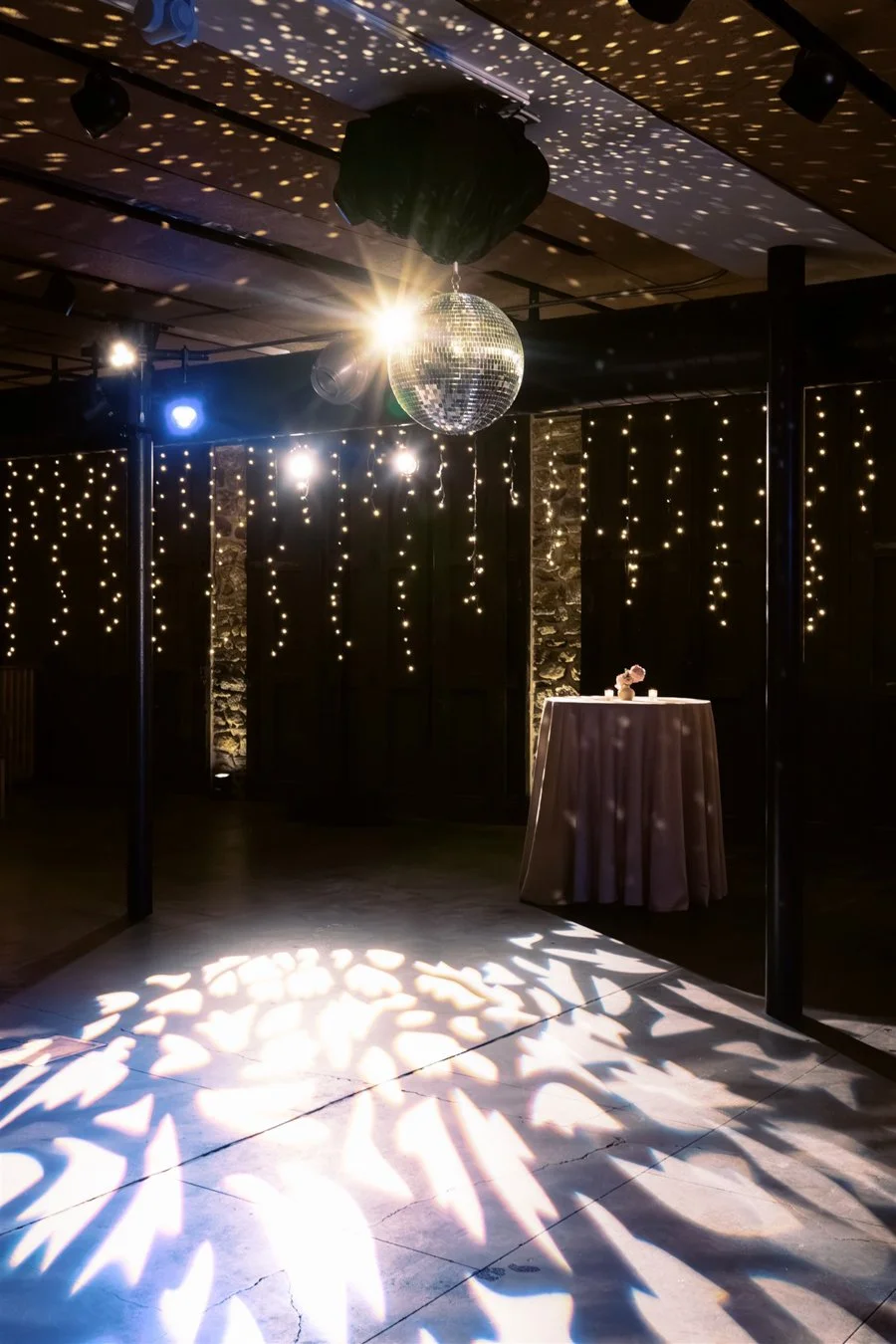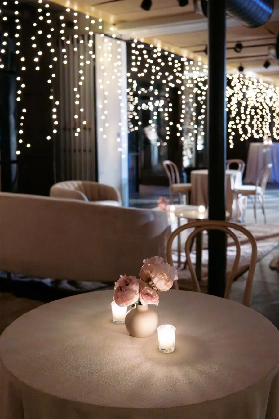 After dinner, guests were invited downstairs to the lower HayBarn for the Horah and a spirited after party. The space was transformed with fairy lights along the wall and a mirrored disco ball above the dance floor. We brought in lounges by Patina featuring curved petal sofas and blush Frida chairs inside, with rattan pieces arranged in the courtyard. Deanna First sketched live fashion illustrations of guests throughout the night, creating one of a kind keepsakes and drawing a steady line of admirers eager to be captured on paper.