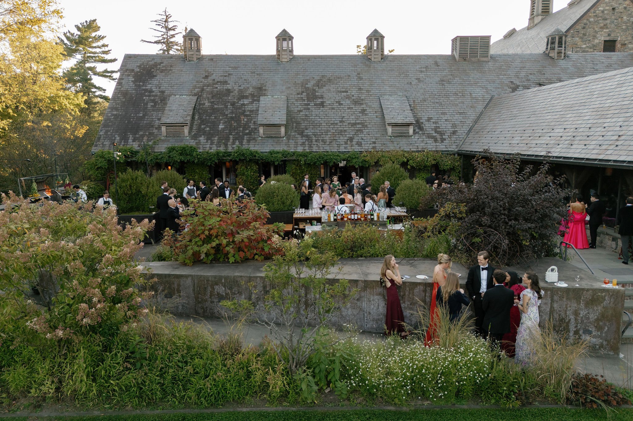 For a smaller format wedding, the cocktail reception takes place outdoors in the dooryard garden, which is stunning spring through fall. It is so special to enjoy the food and drinks while surrounded by vegetable and flower beds, with fruit trees above you. A small sailcloth Sperry tent provides additional cover in the garden. We usually have a bar under the Sperry tent and a second bar further into the Dooryard Garden