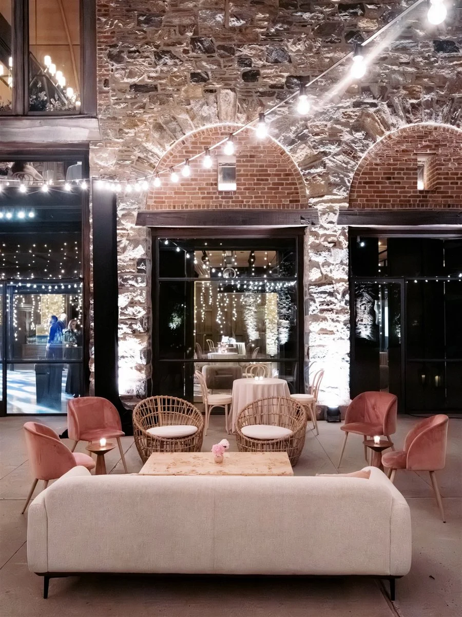 For the larger format weddings, the dancing would take place downstairs with the band or DJ setup in the lower Haybarn. We often design a lounge area in the courtyard as well for guests who may want a break from the dancing. I love using string lights in the courtyard to define the lounge area. Pegasus Productions is the exclusive lighting vendor for Blue Hill at Stone Barns.